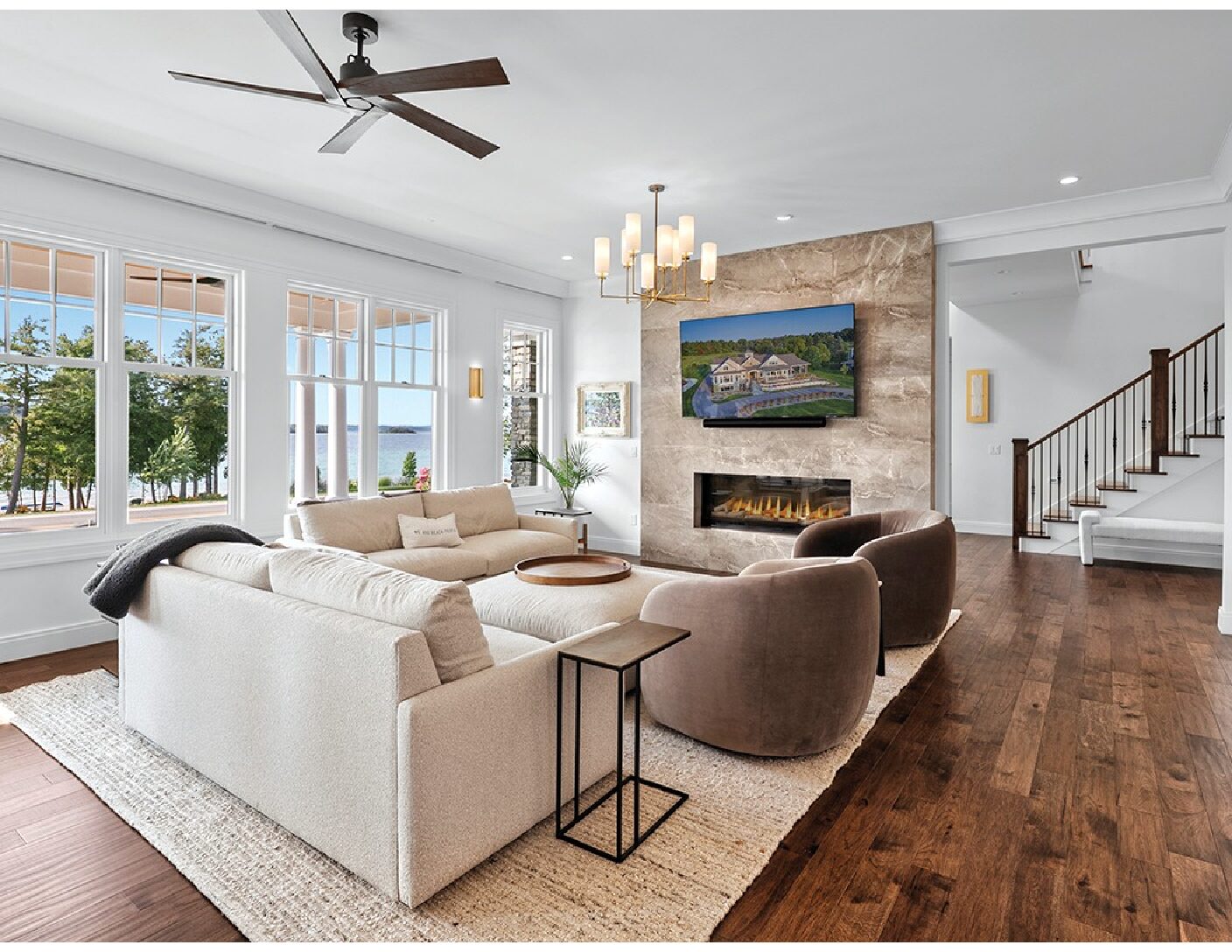 Multiple outdoor spaces celebrate nature in the prime location, which accommodates frequent guests with the in-ground pool, back patio and covered porch that connects to a side terrace with a fireplace. “They wanted the view of the water from as many rooms as possible,” Millward says. “It’s a beautiful home inside and out.”