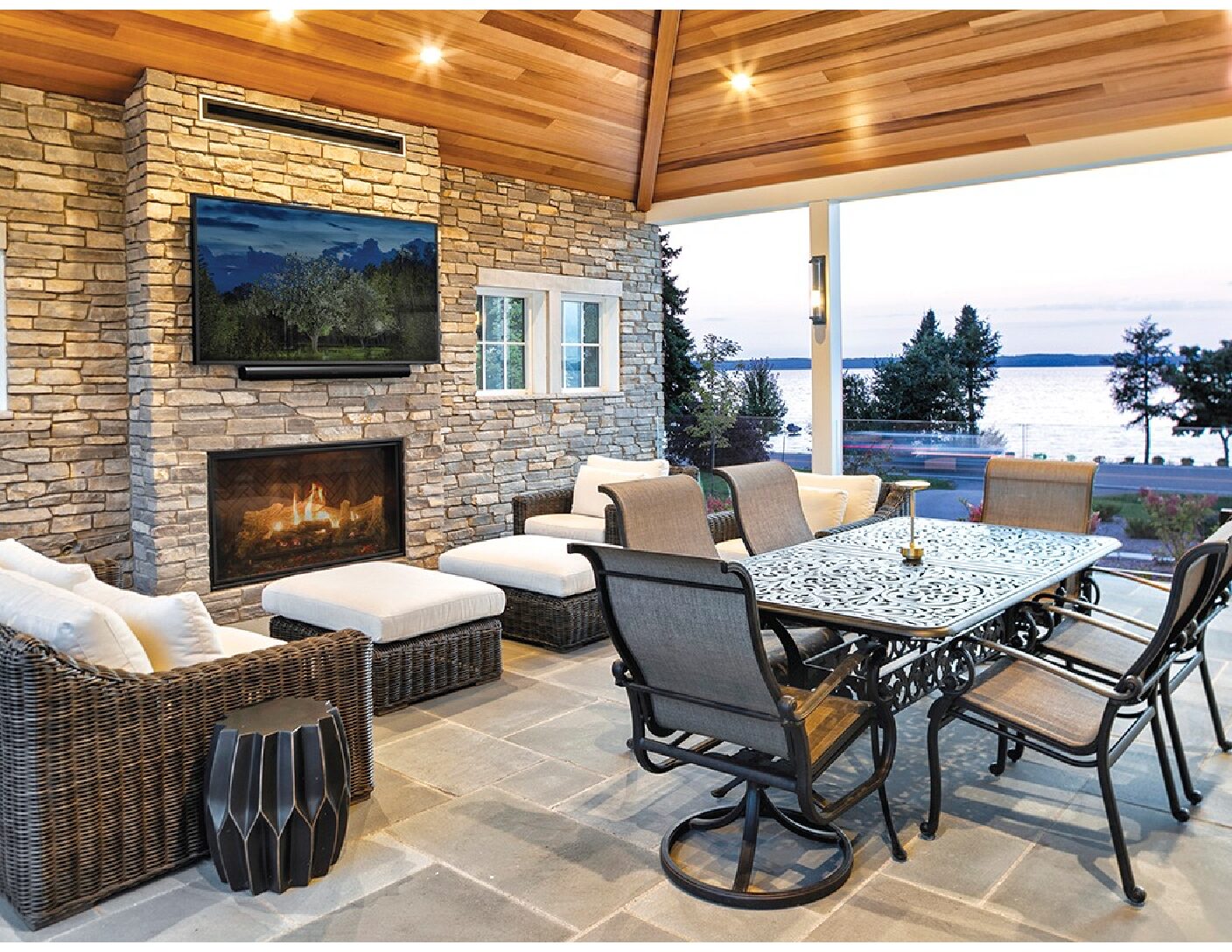 The couple appreciates the seamless flow from the main areas to the terrace. “The house faces West Grand Traverse Bay overlooking Power Island. The sunsets are spectacular,” they say. “The terrace is everybody’s favorite place and it was almost an afterthought.” People also enjoy the back patio and the beach.